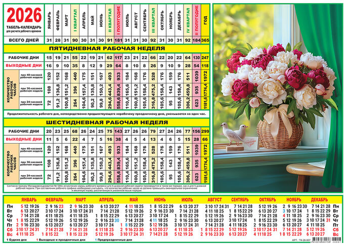 Календарь-табель 2026г "Цветы. Прекрасные пионы"