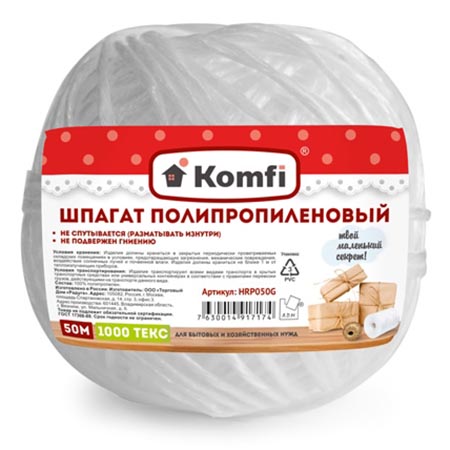 Шпагат " Komfi " полипропиленовый 1,6мм*50м, 1000текс, белый, клубок